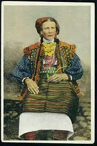 Жінки носили сорочку і дві запаски: одну ширшу ззаду і одну спереду. Запаски пов'язували червоним вовняним поясом. На ногах носили постоли. Зверху одягали як і чоловіки кептар. Дівчата на голові не носили нічого, волосся заплітали спочатку в дві коси (коски), які позаду голови переходили в одну, яку пов'язували червоною стрічкою. Жінки заплітали також косу, але стрічку не пов'язували. На голову жінки одягали чепець, зверху пов'язували чорною або червоною в квіти хусткою, кінці хустки звисали на плечі. На шиї носили кілька шнурків перлів або пацьорки, гердан. Через плече носили вовняну торбу — тайстру.