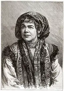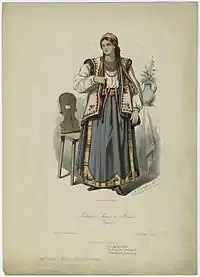 Жінки носили сорочку і дві запаски: одну ширшу ззаду і одну спереду. Запаски пов'язували червоним вовняним паском. На ногах носили постоли. Зверху одягали як і чоловіки кептар. Дівчата на голові не носили нічого, волосся заплітали спочатку в дві коси (коски), які позаду голови переходили в одну, яку пов'язували червоною стрічкою. Жінки заплітали також косу, але стрічку не пов'язували. На голову жінки одягали чепець, зверху пов'язували чорною або червоною в квіти хусткою, кінці хустки звисали на плечі. На шиї носили кілька шнурків перлів або пацьорки, гердан. Через плече носили вовняну торбу.