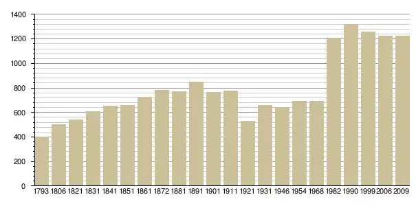 Динаміка населення (base Cassini de l'EHESS pour les nombres retenus jusque 1962[3], base Insee à partir de 1968 (population sans doubles comptes puis population municipale à partir de 2006)[4] · [5] ):