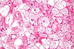 - Часточковий тип. Характеризується різними рівнем диференціації клітин, що можуть бути круглими, овальними з гранулярними еозинофільними клітинами та добреокресленими мембранами, що перемішані з мультивакуольними жировими клітинами. При цьому типі клітин визначається центрально розташоване ядро без ознак плеоморфізму