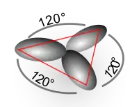 sp2-гібридизація. Відбувається при змішуванні однієї s- і двох p-орбіталей. Утворюється три гібридні орбіталі з осями, розташованими в одній площині і направленими до вершин правильного трикутника під кутом 120°. Негібридизована атомна p-орбіталь перпендикулярна площині і, як правило, бере участь в утворенні π-зв'язків. Прикладом sp²-гібридизації є молекула бензолу, ненасичені полімери, графіт.