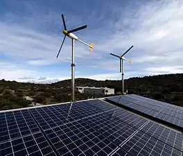 Інші сонячні гібриди включають сонячно-вітрові системи . Поєднання енергії вітру та сонячної енергії має ту перевагу, що два джерела доповнюють одне одного, оскільки пікові години роботи кожної системи припадають на різний час доби та року. Виробництво енергії такої гібридної системи є більш постійним і коливається менше, ніж кожна з двох складових підсистем. [6]
