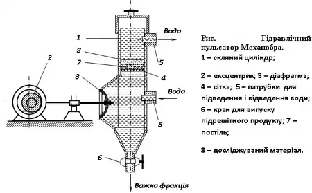 Зокрема, використовується для визначення швидкості проходження зерен скрізь відсаджувальну постіль використовується гідравлічний пульсатор Механобра. Гідравлічний пульсатор Механобра (рис.) складається з двох скляних циліндрів 1 з сіткою 4.