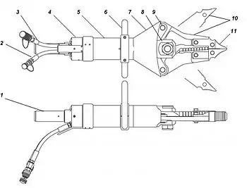 Гідравлічний розтискач-різак Комбінований інструмент (розтискачі-різаки) є універсальним аварійно-рятувальним інструментом, який поєднує у собі функції розтискача (спредера) та різака (ножиць). Проте, з причини поєднання цих функцій, знижуються технічні характеристики комбінованого інструменту. Так само, як і в випадку з розтискачами, разом з цим обладнанням може використовуватись тягове приладдя та різноманітні насадки. В залежності від конструктивних рішень заводів-виготовників, загальне будова розтискачів-різаків може несуттєво відрізнятись. Проте, як правило, комбінований інструмент складається з гідроприводу та ріжучого вузла. Корпус різака закритий захисним кожухом, до якого кріпиться ручка. Гідропривод складається з гідроциліндру зі штоком, керуючого клапана та напірного і зворотного шлангів. Ріжучий вузол складається з двох важелів та щоки, шарнірно з'єднаних між собою. На вільних кінцях важелів установлюються ріжучі губки. На кінцях ріжучих губок встановлюються змінні наконечники.