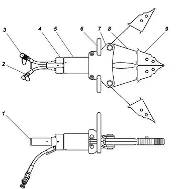 Ріжучий вузол складається з двох важелів та щоки, шарнірно з'єднаних між собою. На вільних кінцях важелів установлюються ріжучі губки.
