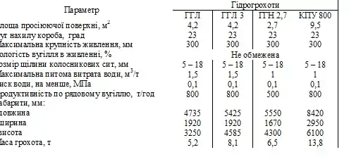 Гідрогрохот типу ГГЛ (рис.), що може бути застосований в практиці вуглезбагачення, складається з короба, в якому встановлена колосникова решітка 1 з шириною щілини 6 – 25 мм. Для рівномірного розподілення навантаження по ширині колосникової решітки в завантажувальній частині короба грохота встановлений шарнірно закріплений розрівнювач 4. Над решіткою встановлені сопла 2 крізь які під тиском 100 кПа подається вода, яка сприяє підвищенню ефективності класифікації. Надрешітний продукт (крупний клас) вивантажується з колосникової решітки в кінці грохота, а підрешітний (дрібний клас зі шламом) – разом з водою надходить на дугові сита 3, які розташовані під колосниковою решіткою. Надрешітний продукт дугових сит (дрібний клас) видаляється з грохота у піддон 6. Підрешітна вода дугових сит разом з шламом видаляється по жолобу 5. Переваги гідрогрохотів полягають у великій продуктивності і ефективності, простоті конструкції та відсутності динамічних навантажень.