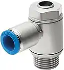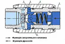 Принцип дії дроселя різьбового монтажу та дроселя із зворотнім клапаном різьбового монтажу (рис. 5): через радіальні отвори (1) у корпусі (2) робоча рідина поступає до дроселюючої щілини (3) між корпусом і дроселюючою втулкою. Шляхом повороту втулки може безступінчасто регулюватися кільцевий прохідний переріз дроселюючої щілини. Дроселювання має місце в обох напрямах. Якщо потрібно дроселювати потік тільки в одному напрямі, необхідний додатковий зворотний клапан. У напрямі дроселювання рідина підводиться справа до зворотного клапана (5) і притискує його до сідла. Процес дроселювання відбувається, як у дроселі. У протилежному напрямі (зліва направо) потік діє на передню поверхню зворотного клапана, примушуючи його відійти від сідла. Робоча рідина вільно проходить через апарат. Одночасно частина рідини проходить через кільцеву щілину, забезпечуючи ефект самоочищення.