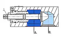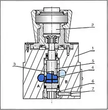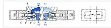Робоча рідина з лінії А1 проходить до лінії А2 підключення гідродвигуна через дроселюючу щілину (1) між клапаном (2) і дроселюючою оправкою (3). Остання може переміщатися в осьовому напрямі установчим гвинтом (4) і, отже, змінювати прохідний переріз дроселюючої щілини (1).