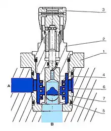 Дроселі та дроселі із зворотнім клапаном патронного виконання у стандартній версії не мають власного корпусу з приєднувальними лініями. Ці апарати угвинчуються або вставляються у відповідні розточування монтажних плит або гідроблоків, у яких виконані відповідні з'єднання. У разі розміщення у монтажній плиті ці апарати можуть сполучатися з іншими за допомогою каналів (наприклад, свердлень). Якщо вони укручені або вмонтовані у відповідний корпус, можуть бути отримані апарати різьбового, фланцевого, стикового або модульного монтажу. Таким чином, патронні апарати можуть використовуватися у найрізноманітніших випадках без будь-якої конструктивної зміни. Дросель із зворотнім клапаном (рис. 7) містить вставний патрон (1), корпус (2) з маховиком налагодження (3), дроселюючу втулку (4) і зворотний клапан (5) з пружиною (6).