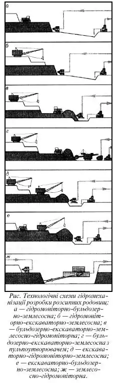 Найбільше поширення гідромеханізація набуває у гідротехнічному будівництві і гірничій справі, як у наземних умовах (розмив ґрунтів, намив гребель, дамб, обвалувань, риття каналів, котлованів, очистка водоймищ і т.i.), так і під землею (гідровідбивання та гідрозакладка, гідротранспорт та гідропідйом). Основною схемою технології є комбінація «гідромонітор-землесос».