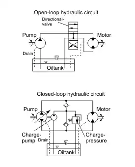 - гідропривод із замкнутою схемою циркуляції, у якому робоча рідина від гідродвигуна одразу повертається у всмоктуючу гідролінію насоса;