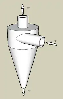 Класифікаційний гідроциклон являє собою циліндроконічний апарат (рис.). Живлення під тиском подається у верхню частину циліндра за допомогою тангенціально розташованої живильної насадки 3. Злив вивантажується через зливний патрубок 4 у циліндричній частині 1 гідроциклона, а піски — через піскову насадку 5, розташовану в конічній частині 2.