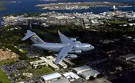 ![]() Військово-транспортний літак C-17 «Глобмастер ІІІ» понад авіабазою Гіккам. 2006 | ||||