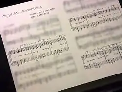 ![]() Репліка рукописної партитури гімну Сінгапуру в експозиції Національного музею. Оригінал на сьогодні в Центрі малайської спадщини (Сінгапур). | ||
