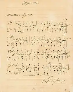 Автор слів — Ференц Кельчеї (Kölcsey Ferenc). Автор музики — Ференц Еркель (Erkel Ferenc).