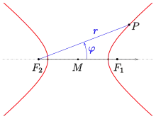 лівим фокусом є і правим фокусом є де e є ексцентриситетом. Позначимо відстані від точки (x, y) до лівого і правого фокусів як і Для точки на правій гілці,