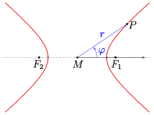 Полярні координати для гіперболи зазвичай використовуються для декартової системи координат, таким чином що їх початок координат знаходиться у фокусі а вісь x направлена в початок "канонічної системи координат" як показано на першому графіку.