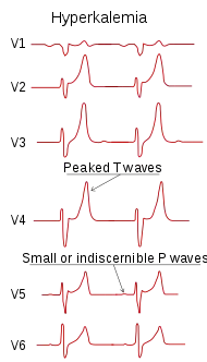 | Електрокардіограма, що показує зміни в грудних відведеннях при гіперкаліємії. | |