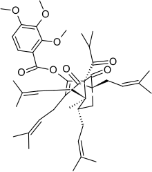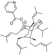 | (1R,5S,6R,7S)-4-Hydroxy-6-methyl-1,3,7-tris(3-methylbut-2-en-1-yl)-6-(4-methylpent-3-en-1-yl)-5-(2-methylpropanoyl)bicyclo[3.3.1]non-3-ene-2,9-dion | |