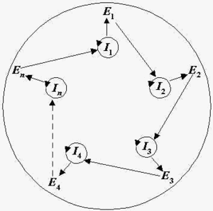 - Полінуклеотиди й поліпептиди утворюють специфічні комплекси, які також проявляють каталітичну активність при синтезі полінуклеотидних копій. Поліпептиди можут бути специфічними репліказами або специфічними кофакторами білка із полімеразною активністю. Усі ці первинні білки забезпечують наявність принаймні двох функцій: специфічної реплікації й трансляції. Математично циклічна симетрія уводиться тим, що припускається утворення специфічного комплексу між ферментом та полінуклеотидом , причому