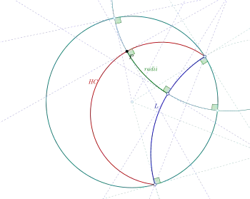 - Якщо точки A, B і C гіперциклу лежать на одній прямій, то хорди AB і BC належать одній і тій самій прямій K. Нехай і є радіусами, що проходять через середні точки хорд AB і BC. Ми знаємо, що вісь L гіперциклу перпендикулярна як до , так і до .