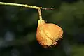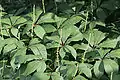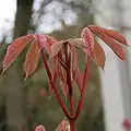 Листопадний кущ заввишки 3-5 м. Коренева система неглибока, розгалужена, з численними дрібними корінцями. Крона густа, розлога. З віком у рослин навсибіч відгалужуються кореневі паростки, від яких відростають нові стовбурці, внаслідок чого у старих особин діаметр крони може сягати 10 м. Кора блідо-сіра, часто з коричневим, жовтим або зеленкуватим відтінком. Листки супротивні, пальчасті, загострені, з дрібнозубчастим краєм, біля основи звужені и трохи заокруглені. Вони складаються з 5-7 листочків еліптичної форми, 12-22 см завдовжки та 5-10 см завширшки кожен. Листя на початку розвитку червонувате, згодом його верхня поверхня стає темно-зеленою, а нижня світло-зеленою. На відміну від інших листопадних гіркокаштанів восени листя цього виду не буріє, а набуває привабливого яскраво-жовтого забарвлення.