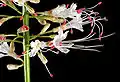 Суцвіття — прямостояча, вузькопірамідальна або циліндрична волоть 20-30 см завдовжки. Квітки двостатеві, дрібні, запашні. Чашечка трубчаста. Листочки оцвітини білі. Тичинки значно довші за пелюстки (3-4 см), білі з рожево-червоними пиляками. Плоди — кулясті або оберненояйцеподібні сухі коробочки, вкриті ззовні тонкою, гладкою шкірочкою світло-коричневого або жовто-коричневого кольору. Кожен плід містить одну насінину завширшки 2-3 см. Насіння лискуче, коричневе з великою, нелискучою, білою плямою.