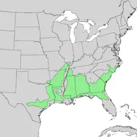 Ареал виду простягається вздовж східного узбережжя США — від Північної Кароліни до Флориди. На півночі він доходить до Міссурі та Іллінойсу, на заході охоплює деякі райони Техасу, на півдні — північні райони Арканзасу, Теннесі і Місісіппі.