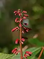 Суцвіття — волоть 10–25 см завдовжки. Квітки червоні, жовто-червоні, на заході ареалу поширена форма з жовтими квітками. Квітконіс 5–12 см завдовжки. Чашечка дзвоникувата або трубчаста, 8–18 мм завдовжки, залозиста. Чашолистиків 5, вони неоднакові за розміром, заокруглені, залозисто волохаті. Оцвітина залозисто запушена. Пелюстки завдовжки 20–40 мм. Тичинок 6–8, вони в нижній частині волохаті, завдовжки 23–36 мм. Пиляки гладкі, з поодинокими волосинками біля основи і верхівки. Плід — куляста або еліптична коробочка завширшки 3,5–6 см. Оболонка плоду блідо-коричнева, гладка. Всередині плоду містяться 1–3 (рідше 4–6) насінини завширшки 2–3 см. Їх колір варіює від червонувато-коричневого до жовтаво-бурого, на кожній насінині помітна білувата пляма. Насіння отруйне.
