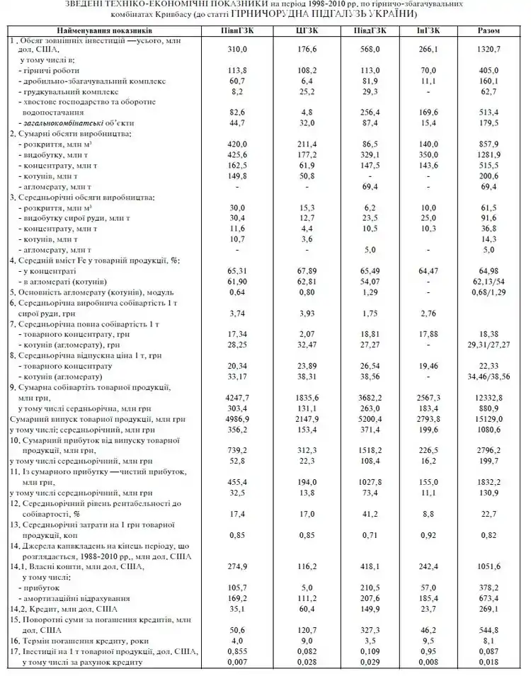 - Характеристика діяльності основних ГЗК Кривбасу за період 1998-2010 рр.