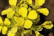 Суцвіття — китиця, що складається з жовтих чи блідо-жовтих, радіально симетричних квітів прибл. 1.5 см упоперек. Суцвіття подовжується на стадії плодоношення. Пелюстків 4, зворотнояйцеподібні, (0.8)0.9–1.2(1.7) см × (3)4–6(7.5) мм. Чашолистків 4, жовті або зелені, вузько-довгасті, (4.5)5–6(7) × 1–1.8 мм. Тичинок 6, з них 4 довгі та 2 короткі. Плодоніжки (2)3–7 мм. Стручок щетинистий, лінійний, (1.5)2–4.5(5.7) см × (1.5)2.5–3.5(4) мм завдовжки, закінчується дзьобом 1–2 см довжини, в середньому 4–8-насінний. Насіння темно-червоне або коричневе або чорне, гладке, кулясте, 1–2 мм в діаметрі. 2n = 18.