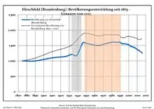 Динаміка населення з 1875 року в сучасних кордонах (Синя лінія: населення; Пунктир: відносна порівняльна динаміка населення землі Бранденбург; Сірий фон: період Третього рейху; Помаранчевий фон: період НДР)