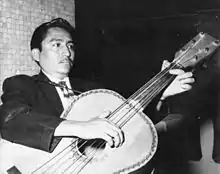 ![]() Музика-маріачі у традиційному костюмі грає на гітарроні | |