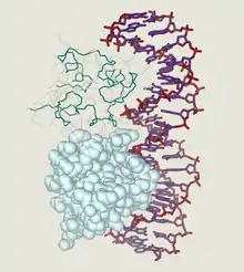 ДНК-зв’язуючі білки [3][4][5] - це Білки, які утворені з ДНК-зв’язуючих доменів, а отже мають специфічну чи загальну спорідненість до одно- або двониткових ДНК. ДНК-зв’язуючі білки, які є сайт-специфічними, в основному взаємодіють із великою борозенкою B-ДНКа, тому що вона експонує більше функціональних груп, які ідентифікують пару основ. Однак відомі і до малої борозни ДНК-зв’язуючі ліганди, такі як Нетропсин, [6] Дістаміцин, Hoechst 33258, Пентамідин, ДАФІ(4.6-диамідо-2-фенол-індол) та інші.[7]