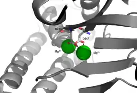 Після приєднання субстрату, ДНК-полімераза II зв’язує NTP для підтримки водневих зв'язків у структурі ДНК. Потім зв’язується правильний, непошкоджений нуклеотид (dNTP), і ферментний комплекс зазнає конформаційних змін субдоменів та амінокислотних залишків. Ці конформаційні зміни дозволяють прискорити процес репарації.[14] Активний центр ферменту містить два іони Mg2+ , які стабілізуються каталітичними аспарагіновими кислотами D419 і D547.[15] Іони магнію зв’язуються з ДНК разом з dNTP у відкритому стані та координують конформаційні зміни амінокислотних залишків активного центру для того, щоб відбувався каталіз (закритий стан). Після вивільнення іонів магнію фермент повертається у відкритий стан.[16]