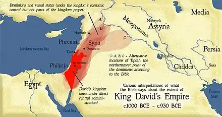 Царство Давида простягалося від Еціон-Ґеверу на Акабської затоки на півдні до кордону Емафа на півночі і займало, за винятком вузьких прибережних смужок, населених філістимлянами і фінікійцями, весь простір між морем і Аравійською пустелею. У той час Ізраїль в основному досяг меж Землі обітованої.