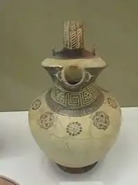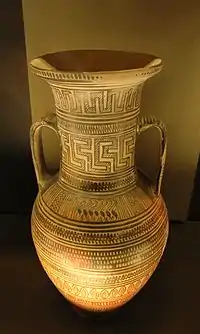 На жовтому або вохристому фоні темно-коричневої фарби горизонтальними фризами наносився геометричний орнамент, виділяючи при цьому колами, трикутниками та хвилястими лініями найважливіші елементи зображуваних фігурок, які зводились до спрощеної умовної схеми, підкореної загальному ритму геометричного орнаменту. Серед геометричних малюнків поступово з'являлися більш складні зображення тварин і людей.