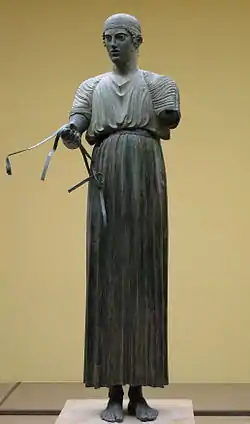 Одночасно в мистецтві повною мірою втілився ідеал людини-героя, довершеної фізично та духовно. Більшість скульптур дійшла до нас у пізніших римських копіях. Серед тих, що збереглись, чільне місце посідає скульптура Дельфійський візничий, створена близько 470 до н. е. Молодий чоловік зображений в повний зріст, одягнений в довгий хітон, перев'язаний поясом на талії із віжками в руках. Хвилясті складки його одягу нагадують каннелюри доричної колони, проте його обличчя з очима із кольорового каміння набуває живості та одухотвореності. Образ Дельфійського візничого уособлює ідеал довершеної людини, рівної героям епоса.