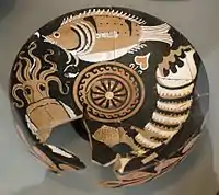 Проте вже до кінця 7 століття до н. е. килимовий стиль поступається чорнофігурному вазопису, який досягає розквіту в 6 столітті до н. е. Тепер зображення наносили густим чорним лаком і підфарбовували глину вохрою, від чого після обпалу вона набувала червоного відтінку. Одним з найбільш майстерних вазописців в техніці чорнофігурного вазопису, чиї ім'я дійшло до нас, був гончар Ексекій, який творив близько 550—530 років до н. е. Знаменитий кілікс «Діоніс у човні», тондо якого зображує Діоніса в човні під виноградним гроном, оточеного дельфінами. Зворотна сторона чаші вкрита очима, які мали захистити того, хто пив з кілікса від пристріту. Тут зображено легенду про те, як пірати вирішили продати Діоніса в рабство, не знаючи, хто він такий. Коли корабель вийшов в море, по палубі текло вино, щоглу обвили виноградні лози і з'явились хижі тварини — супутники Діоніса. Налякані пірати рятувались, стрибаючи у воду, проте не долітаючи до неї, перетворювались на дельфінів.