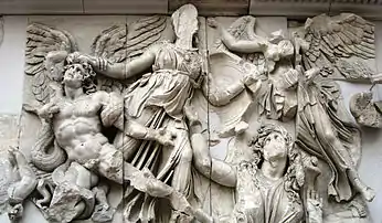Тема боротьби знайшла своє відображення й в ансамблі рельєфів, що прикрашали вівтар Зевса, побудований у Пергамі близько 180 до н. е. — відоміший як Пергамський вівтар. Вздовж його цоколя довжиною 120 метрів тягнулися рельєфи зі сценами боротьби олімпійських богів з титанами — гігантомахія. Завдяки високій техніці рельєфу скульптури досягли цікавої світлотіньової гри, яка створювала відповідний емоційний настрій. Драматизм боротьби виражений і в різноманітності рухів, ракурсів, поз персонажів. Створюється враження, неначе всі вони поєднанні в один живий гігантський вузол із людських тіл, коней, зміїних хвостів, крил тощо.