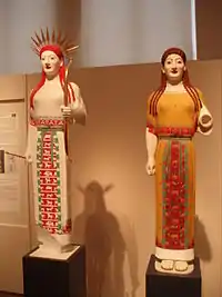 Подібно до архітектурних споруд, давньогрецькі скульптури також не були монохромними. На багатьох архаїчних статуях збереглись фрагменти фарб. Волосся кор традиційно зображували золотистим, очі та брови — чорними, рожевий відтінок мармуру чудово передавав тон людської шкіри. Не менш ошатними був й одяг жриць. В цей же час підйьому та визнання досягає Хіоська школа скульптури, яскравим представником якої був Бупал.