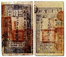 За неолітичних часів такими були черепашки каурі: система китайської ієрогліфіки дотепер вживає їх зображення 貝\贝 на ознаку понять, пов'язаних із коштовністю та комерцією (货, 赔); з періоду Чуньцю відомі також монети у формі ножа чи лопати. Монети класичної форми, круглі із квадратною дірою посередині, утворені приблизно у середині 4 ст. до н. е. Найраніші в світі паперові гроші відомі з 7 ст. (т.з. «летючі гроші» 飛錢 дин. Тан), але широкого розповсюдження вони набули лише за династії Сун (11 ст.).