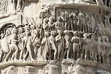 чотирнадцятий, обраний імператором в шостий раз, консул в п'ятий раз, батько Батьківщини. Пішоходи та вершники служать у намисті, прикрашеному титулами