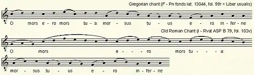 Літургійний репертуар давньоримської традиції і григоріанського мейнстриму схожий (жанри і форми, а також літургійне розподіл розспівів у денному колі богослужіння), а у техніці музичної композиції є деякі риси, які дозволяють говорити про оригінальність давньоримського розспіву. Найочевидніша різниця у вокалізації молитвословного тексту — співи давньоримської традиції мелодично розвиненіші, ніж їх північні аналоги, та є зразками розспіву мелізматичного типу. Це підкреслюється пишною орнаментацією, що характерна для всіх жанрів співів — не тільки меси, але і офіції.