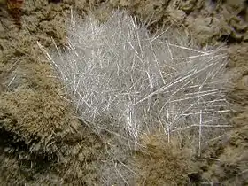 Утворює тонкі кірочки та розетки від плосковитягнутих до голчастих кристалів.
