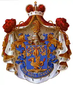 Над щитом срібний із золотими прикрасами шолом зі стрілкою та кольчугою, коронований золотою короною. Нашоломник: золоте крило дракона. Намет: лазуровий з золотом. Девіз: «НОС NOLI TANGERE» золотом на лазуровій стрічці. Герб прикрашений червленою, підбитою горностаєм, мантією з золотими китицями, увінчаний княжою короною.