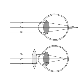 - Абсолютну гіперметропію, яка потребує корекції лінзами, оскільки сили акомодації недостатньо. Пацієнти скаржаться на поганий зір та втомлюваність очей.