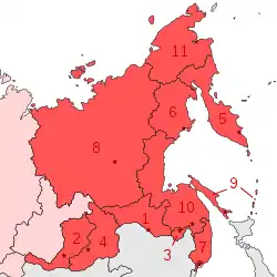 Далекосхідний федеральний округ покриває територію Російського Далекого Сходу і підрозділяється на 9 регіонів: