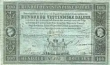 Після переходу островів під пряме підпорядкування Данії в 1757—1767 роках на монетних дворах Копенгагена, Альтона і Конгсберга для заморських територій випустили 6, 12 і 24 скілінги. У XIX столітті в різні роки карбували 2, 10 і 20 скілінгів. Всі монети містили позначку «Dansk Amerik(ansk) M(ynt)» (Данське американське карбування)[97][98]. Першу банкноту номіналом 6¼ ригсдалера надрукували 1784 року[99]. Згодом[комент. 5] випускали банкноти номіналом 5, 10, 20, 50 і 100 ригсдалерів[99].