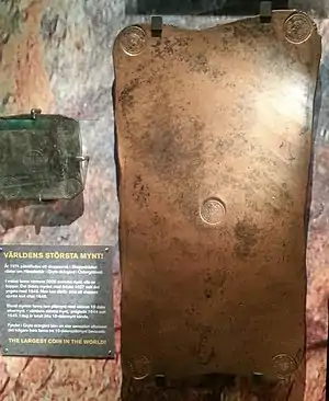 Вказівка в договорах «silvermynt» або «kopparmynt» не означала, що платіж необхідно здійснити срібними або мідними монетами. Вона вказувала на системи грошового обігу, між якими існували відповідні співвідношення. Більш того, в державі чеканили мідні монети із зазначенням номіналу в ере «S. M.», що свідчило про вміст у ній еквівалентної срібній монеті за ціною кількості міді[32][33]. 1644 року, за королеви Христини, почали виробляти великі мідні таблички з клеймами монетного двору, що прирівнювали їх до певної кількості срібних далерів. Мідні виливки були досить важкими і, відповідно, непридатними для проведення щоденних торгових операцій. Так, наприклад, мідна плата, що дорівнює 10 риксдалерам, важила 19,715 кг. Випускали подібні гроші досить довго, аж до 1760 року[30]. Співвідношення ціни срібла і міді зазнавало коливань. Плати з номінальною вартістю 2 далери сріблом отримали назву «риксдалерплот» (швед. Riksdalerplåt)[34]. За аналогією з риксдалерплотами в Російській імперії в 1720-х роках випустили мідні повноцінні гроші номіналом рубль, полтина і нижче. За монетної стопи 10 рублів з пуда, плата номіналом 1 рубль мала важити 1,6 кг.[35]